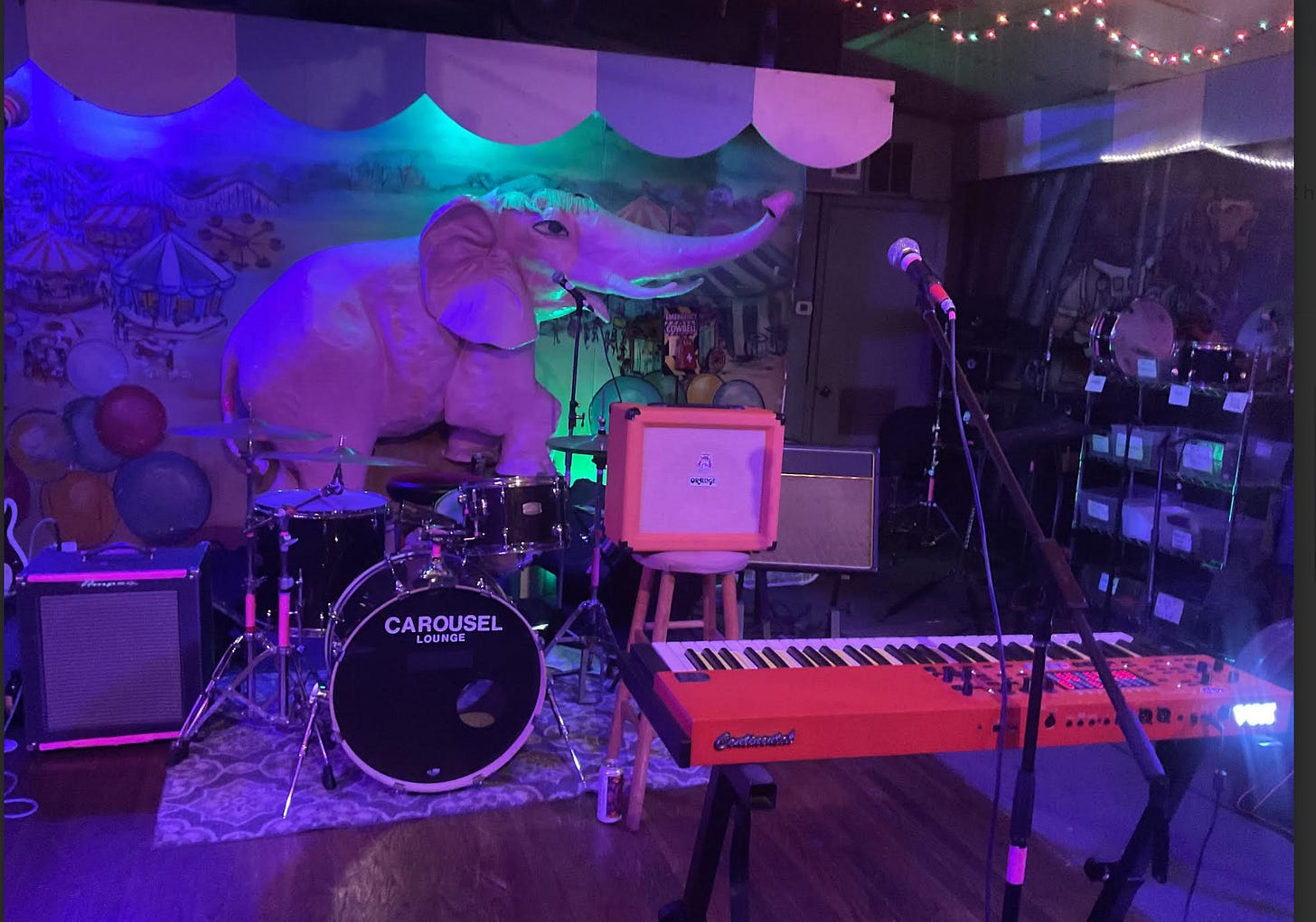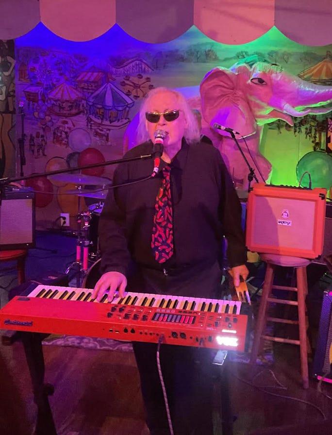 So, with all my history with this band, how did I feel seeing them again last Friday night? Did I find myself back in 1986, standing in the sweaty leather-jacketed crowd close to the stage downstairs at the Rat in old, pre-gentrified Kenmore Square? No, it’s 2026 and a different dive bar in a different city. I’m at the Carousel Lounge, a circus-themed venue and a genuine piece of Old Austin — dating to 1963 — strung with holiday lights (it’s mid-February) with clowns, acrobats and a tightrope-walking monkey painted on the walls, on an almost deserted working-class block in North Central East, thinking Please, God, let them be the band I remember. I know they’re not kids anymore and I don’t expect them to be, but I want them to be the goddamn Lyres, I want Jeff Conolly in good form and ready to go.